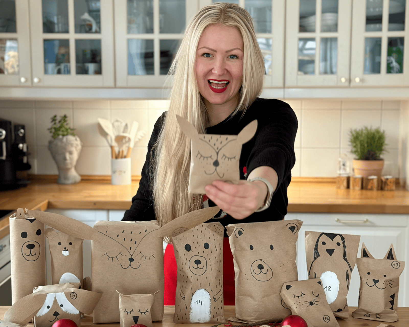 Packt alle 24 Geschenke in braunes Packpapier ein. Nun malt ihr mit einem schwarzen Filzstift ein schönes Gesicht drauf. Mit weißer Deckfarbe und Pinsel könnt ihr noch ein paar Highlights setzen. Nur noch durchnummerieren und schon ist euer individueller Adventskalender fertig. Teilt euch die Arbeit ein. Einen Tag für das Suchen der Geschenke, einen Tag zum Verpacken und einen Tag für das Bemalen und Beschriften. Somit ist der Kalender schnell vorbereitet – ganz ohne Stress.